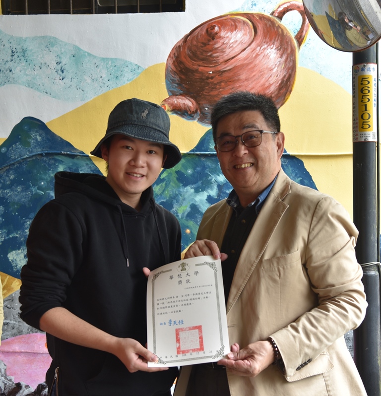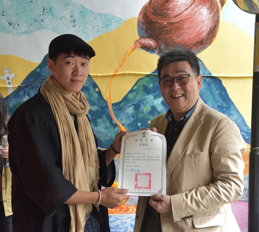 李天任校長(右)頒發獎狀給參與淡蘭一號彩繪牆活動的美術與文創學系同學,由曲宣同學代表領獎。
