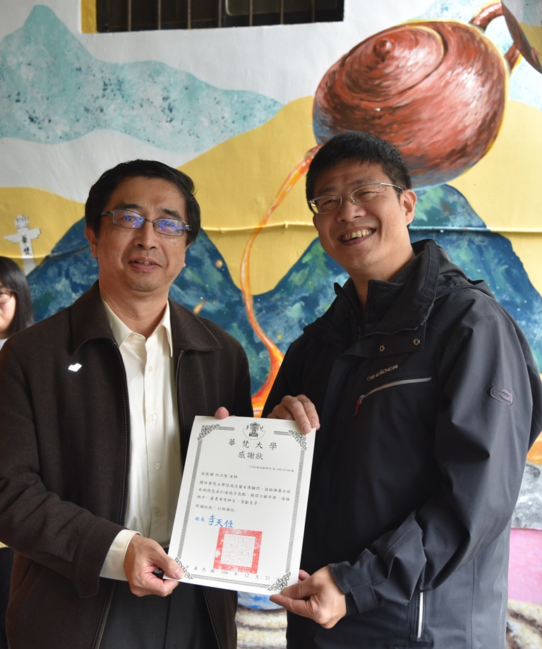 蔡傳暉教務長(左)頒發感謝狀給何立智教授,擔任華梵大學悠遊淡蘭首席顧問。
