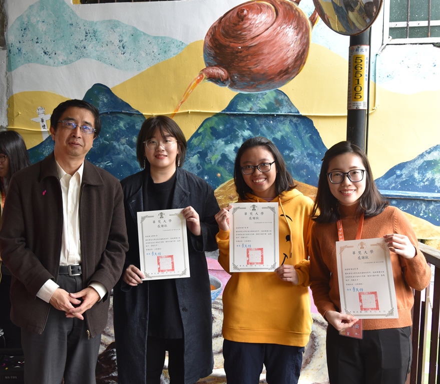 蔡傳暉教務長(左一)頒發感謝狀給悠遊淡蘭駐地青年(左至右)白郡婷、楊子瑩、陳友君。