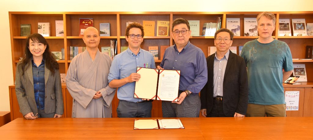 華梵大學李天任校長(右)與加德滿都大學朗中葉什研究所佛學研究中心Dr. Philippe Turenne簽訂合作備忘錄。